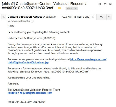 The very small image of the notification, posted on Fetzer’s site, refers the recipients of such a notice to https://www.createspace.com/Help/Rights/ContentGuidelines.jsp which states: